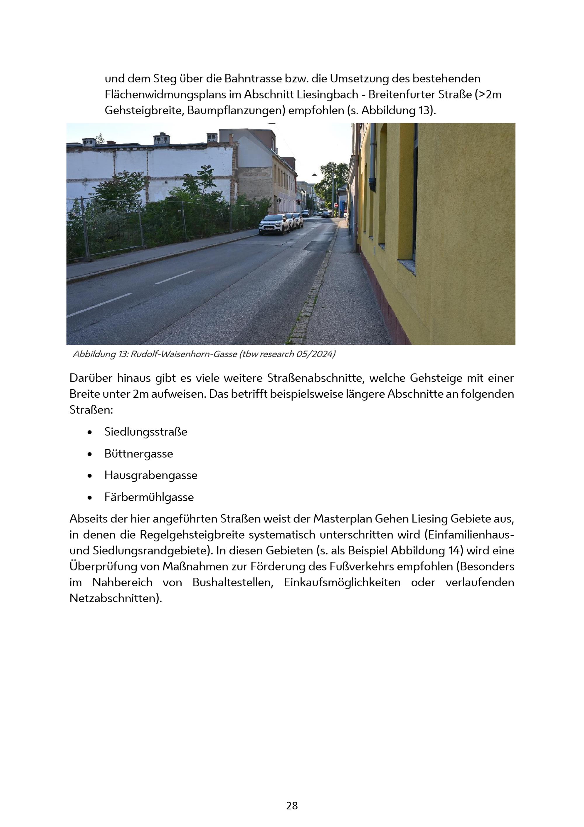 Masterplan Gehen Liesing : Fußverkehrskonzept für den 23. Wiener Gemeindebezirk / erstellt für Magistratsabteilung 18 - Stadtentwicklung und Stadtplanung der Stadt Wien vertreten durch Roman Riedel im Rahmen des Bezirksauftrages für den 23. Bezirk ; Auftragnehmer: tbw research GesmbH, Bearbeitung durch: Clemens Raffler, Julia Simhandl