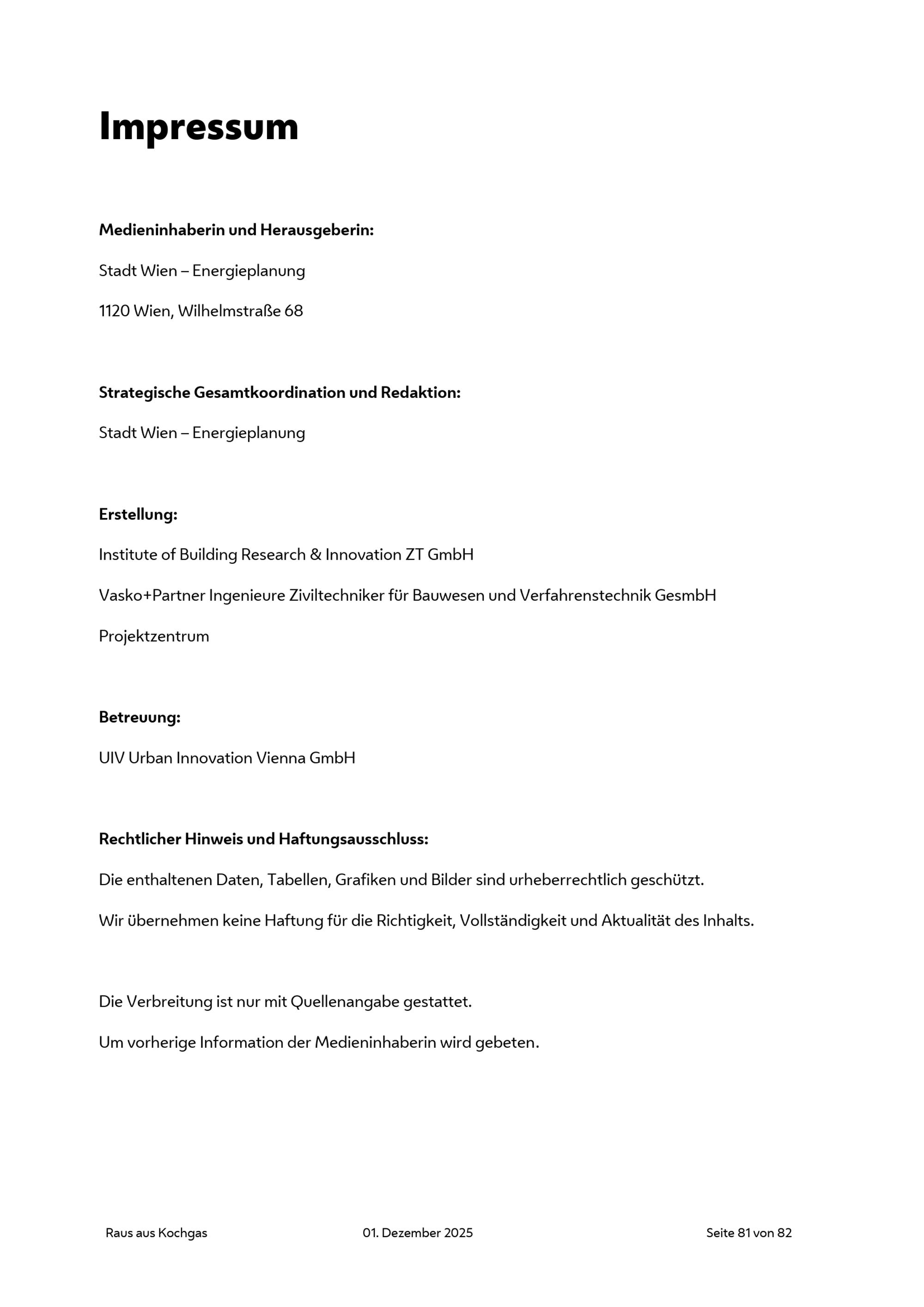 Raus auch Kochgas : technische Studie : Veröffentlichung im Sinne des § 4 IFG / von IBR&I Institute of Building Research & Innovation, Vasko+Partner Ingenieure und Projektzentrum ; im Auftrag der Abteilung Energieplanung der Stadt Wien