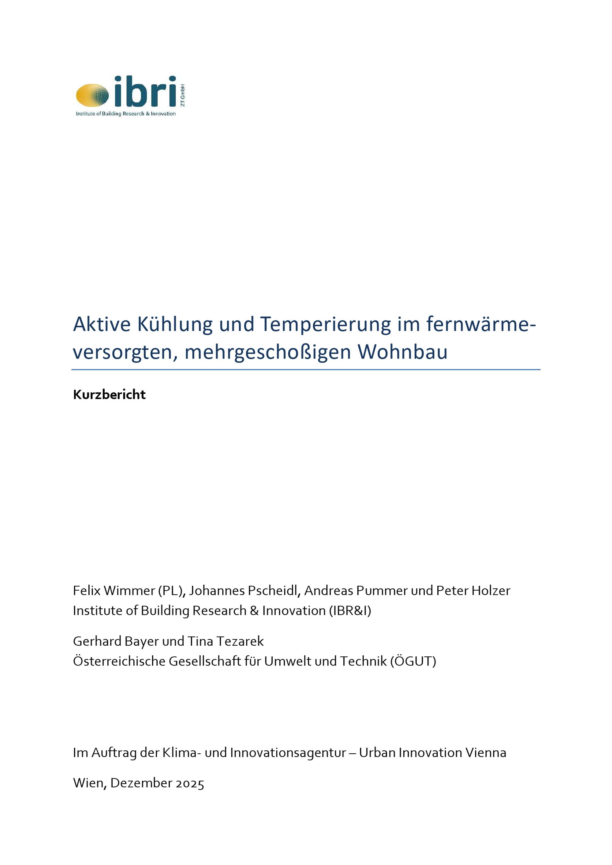 Aktive Kühlung im fernwärmeversorgten Wohnbau : Kurzbericht ; Veröffentlichung im Sinne des § 4 IFG / Institute of Building Research & Innovation (IBR&I), Österreichischen Gesellschaft für Umwelt und Technik (ÖGUT) ; im Auftrag der Abteilung Energieplanung der Stadt Wien