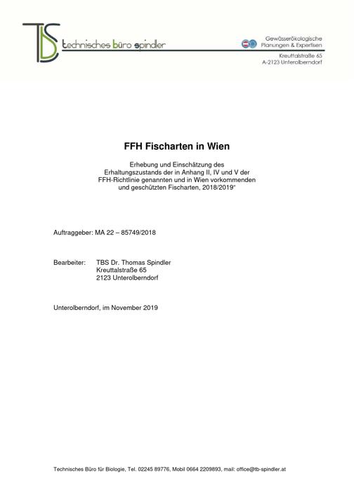 FFH Fischarten in Wien : Erhebung und Einschätzung des Erhaltungszustands der in Anhang II, IV und V der FFH-Richtlinie genannten und in Wien vorkommenden und geschützten Fischarten, 2018/2019“ / TBS Dr. Thomas Spindler ; Auftraggeber: MA 22