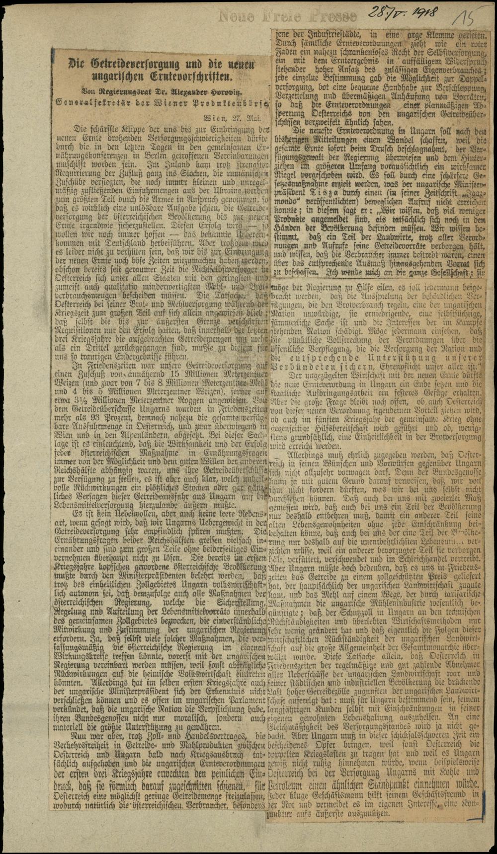 Die Getreideversorgung und die neuen ungarischen Erntevorschriften.