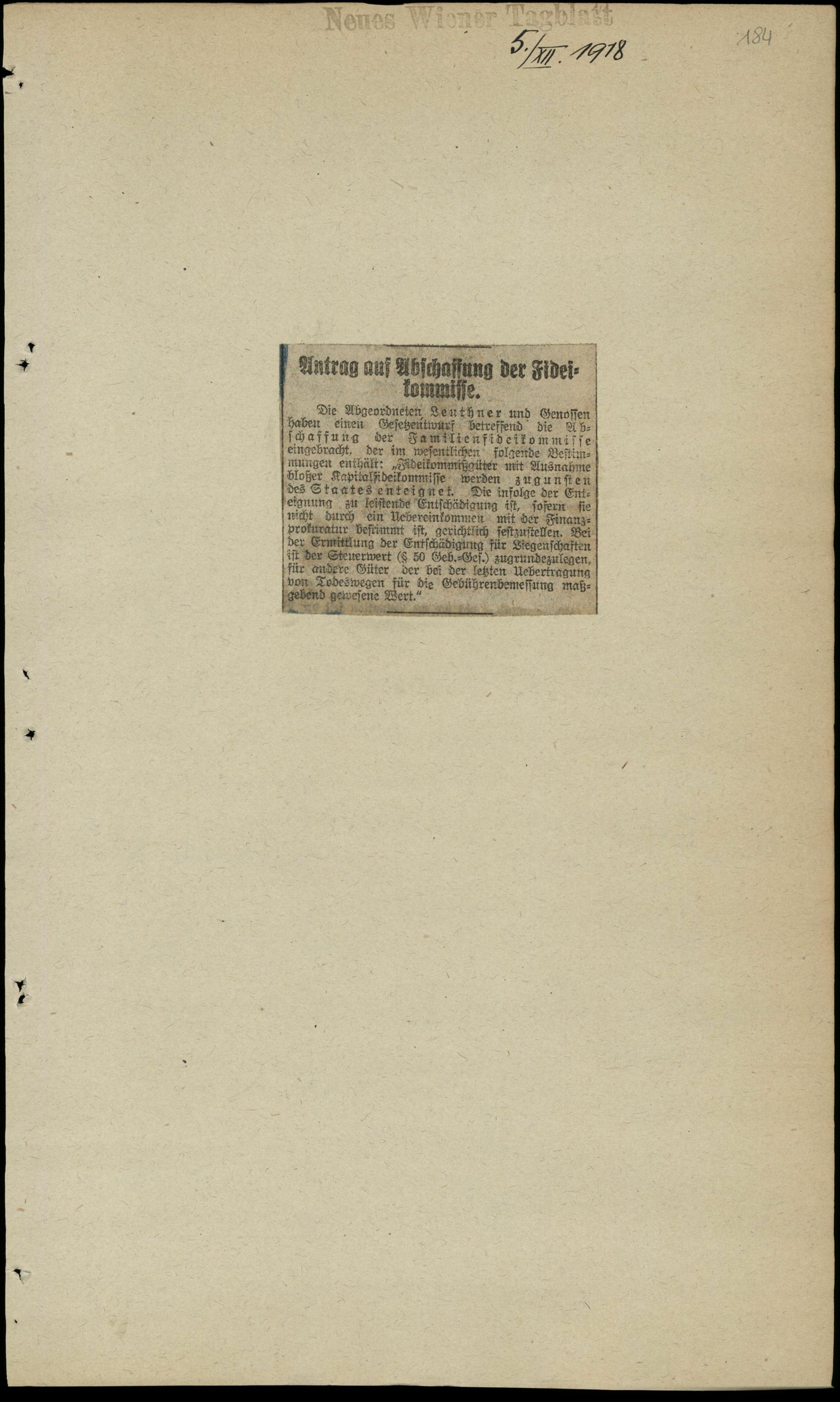 Antrag auf Abschaffung der Fideikommisse.