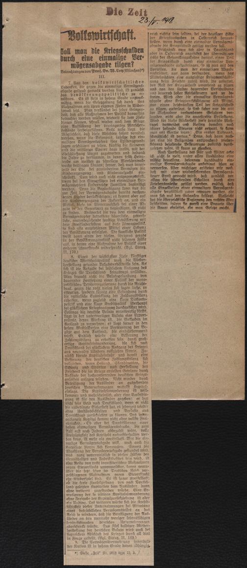 Volkswirtschaft. Soll man die Kriegsschulden durch eine einmalige Vermögensabgabe tilgen?