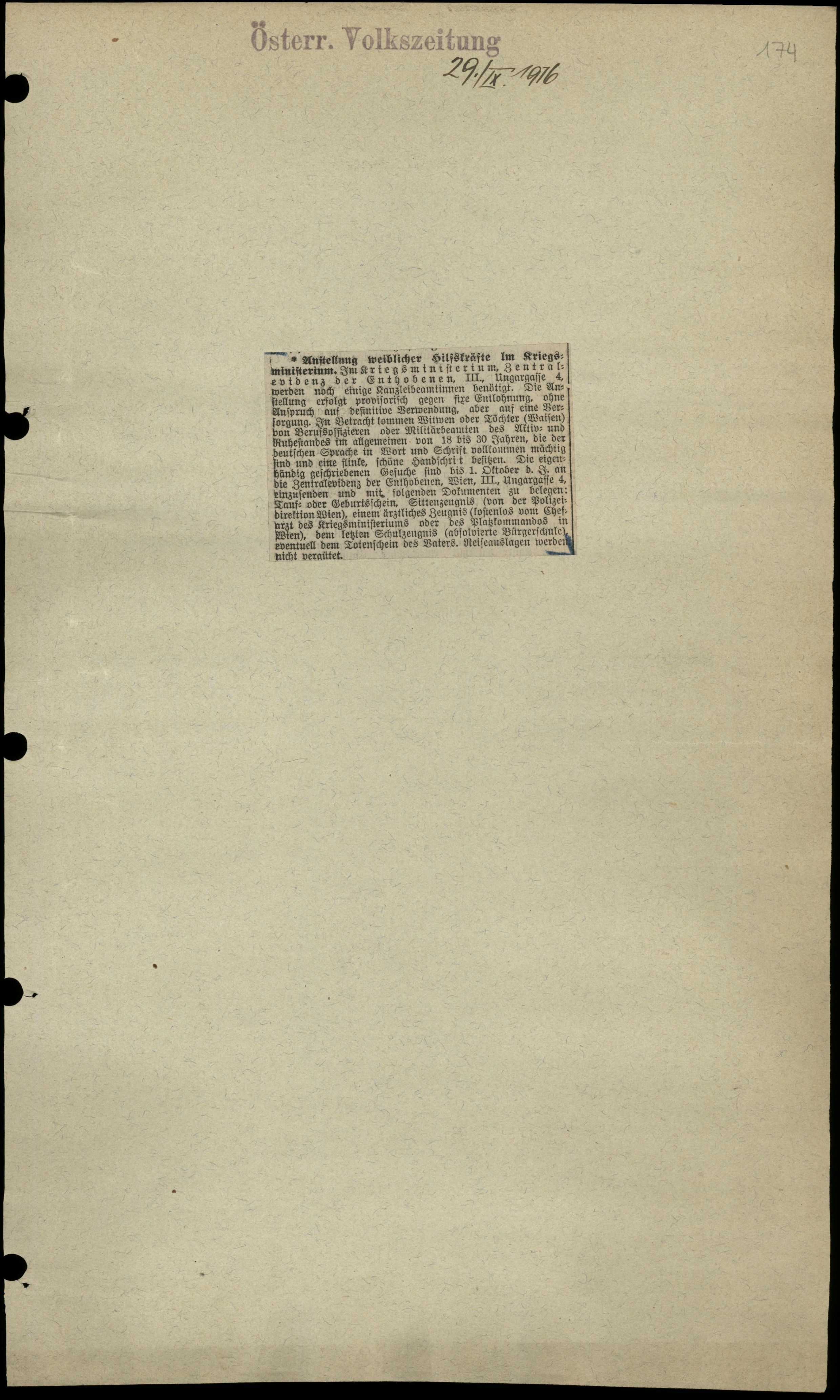 Anstellung weiblicher Hilfskräfte Im Kriegsministerium.