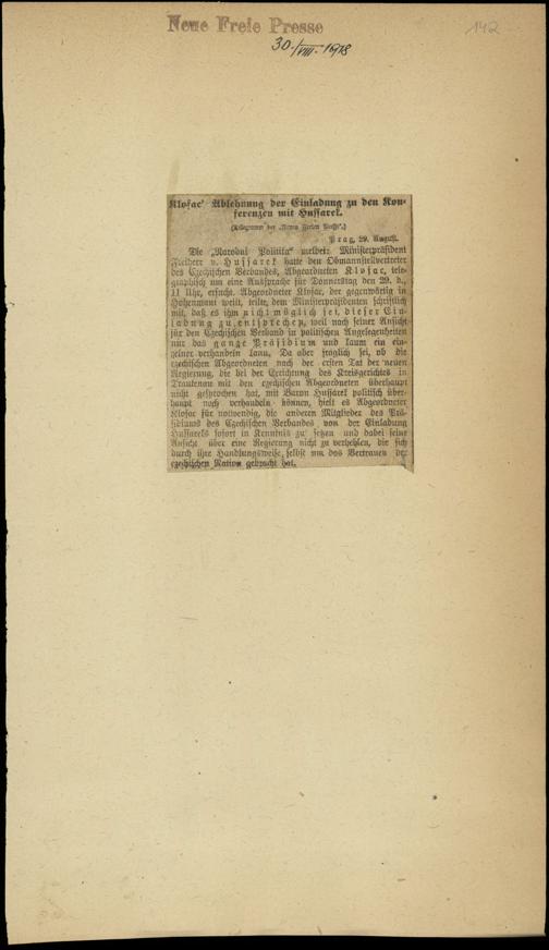 Klofac' Ablehnung der Einladung zu den Kon-ferenzen mit Hussarek.
