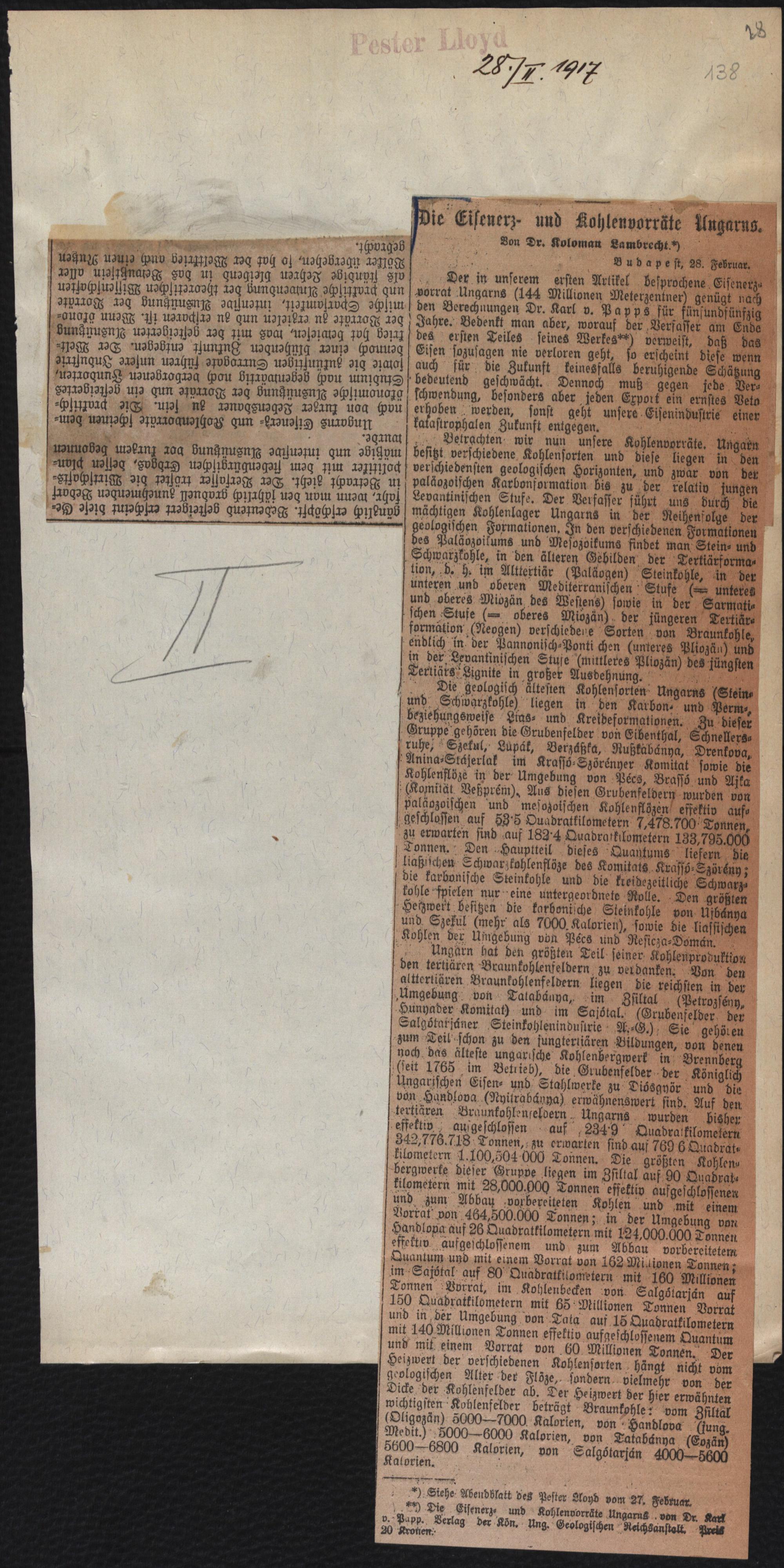 Die Eisenerz- und Kohlenvorräte Ungarns.