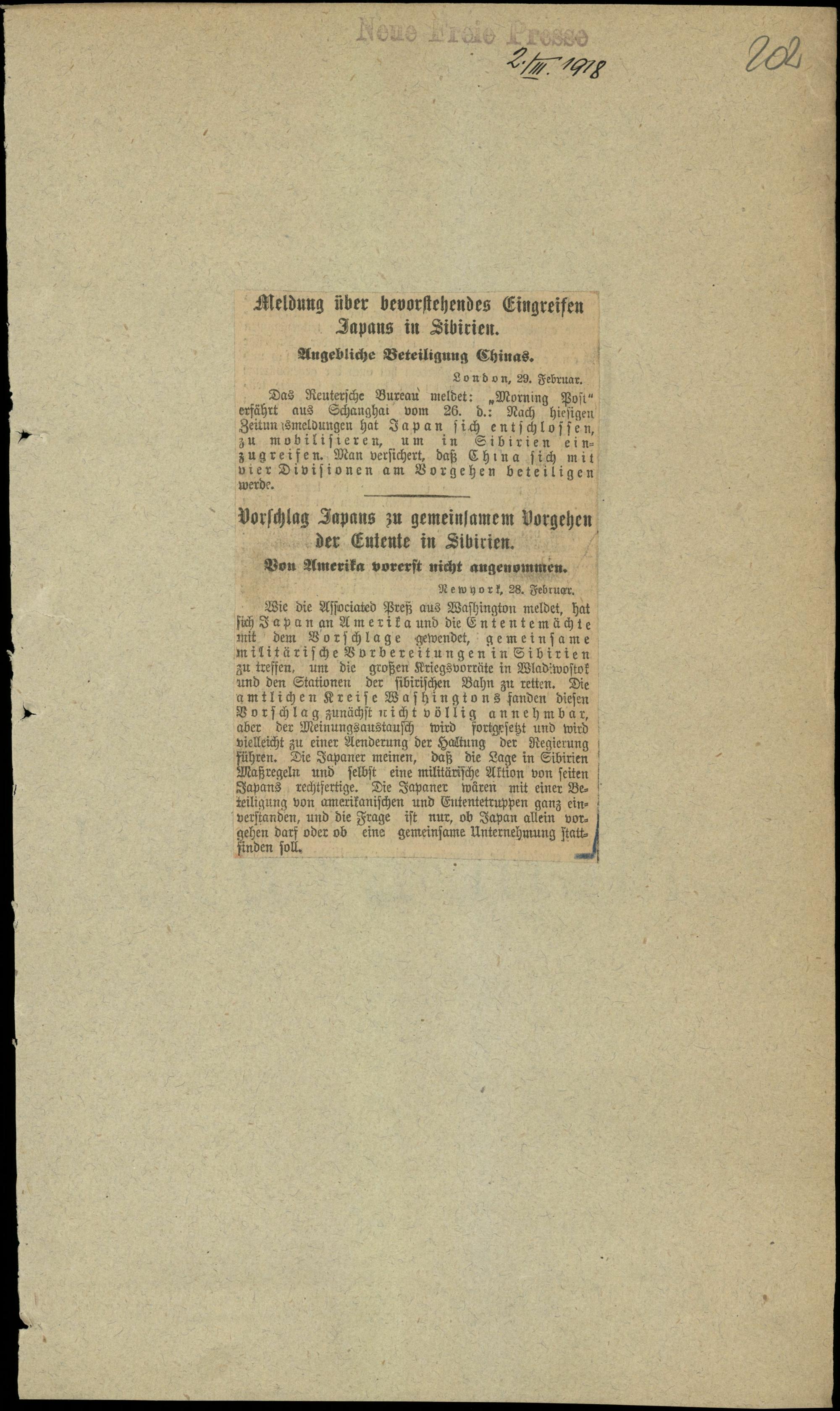 Meldung über bevorstehendes Eingreifen Japans in Sibirien