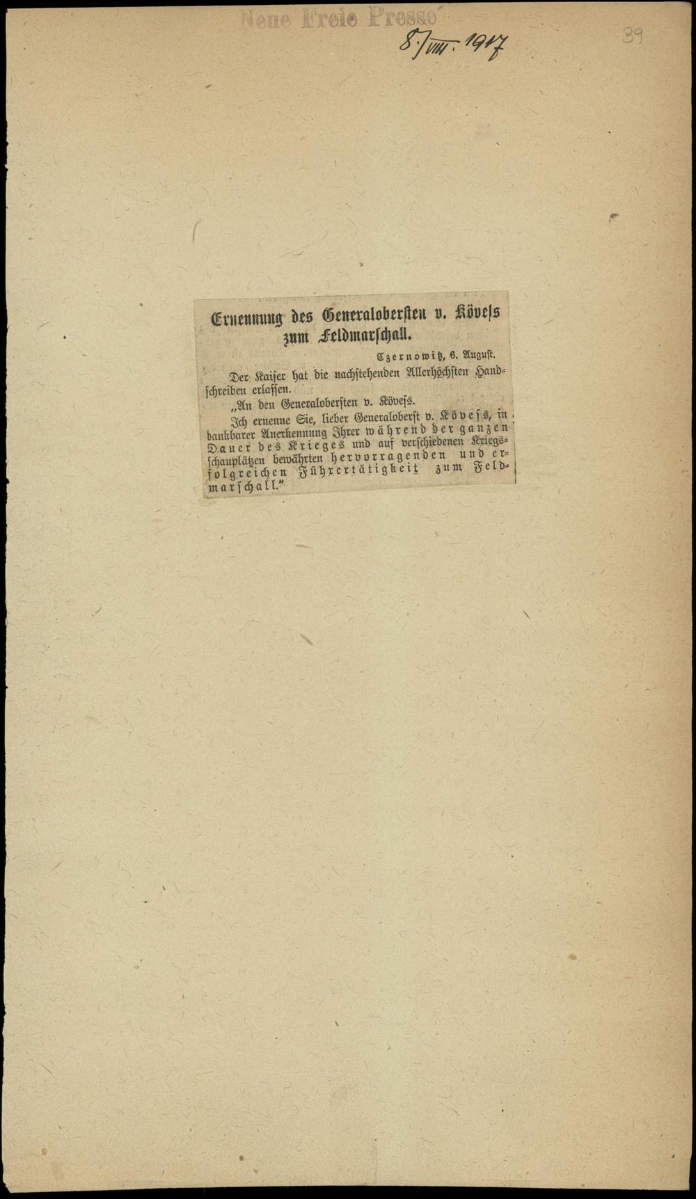 Ernennung des Generalobersten v. Kövefs zum Feldmarschall.