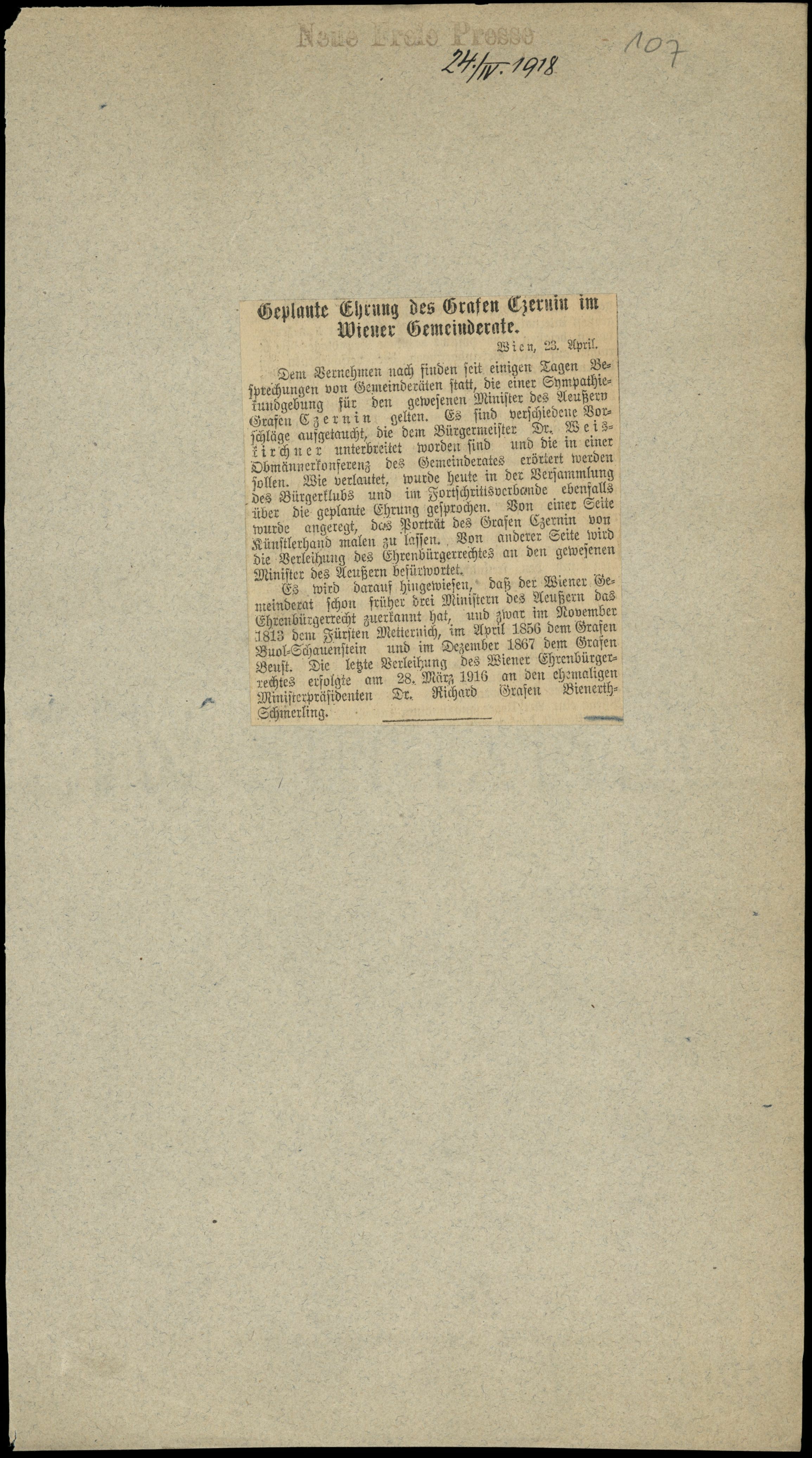 Geplante Ehrung des Grafen Czernin im Wiener Gemeinderate.