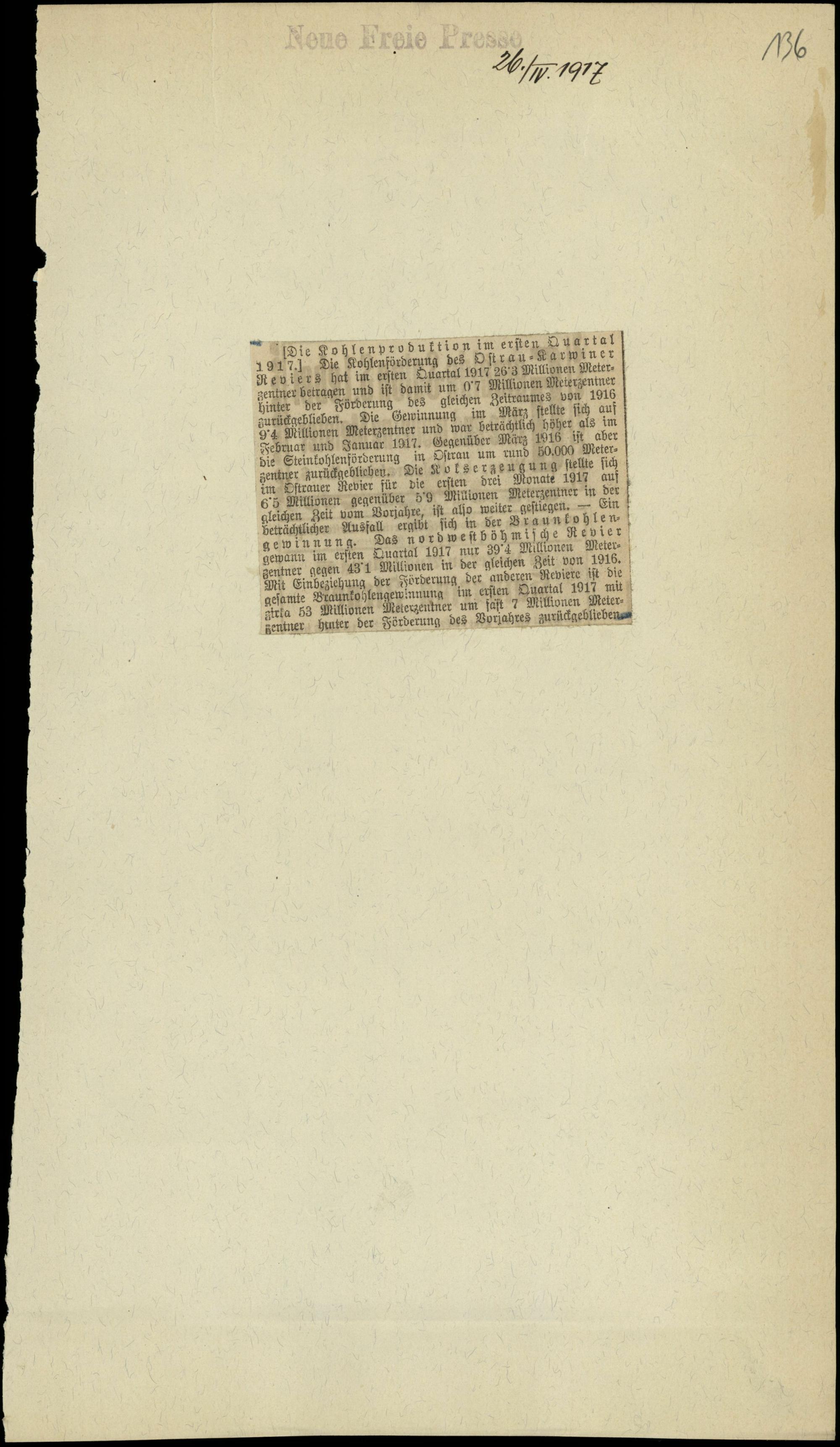 Die Kohlenproduktion im ersten Quartal 1917.