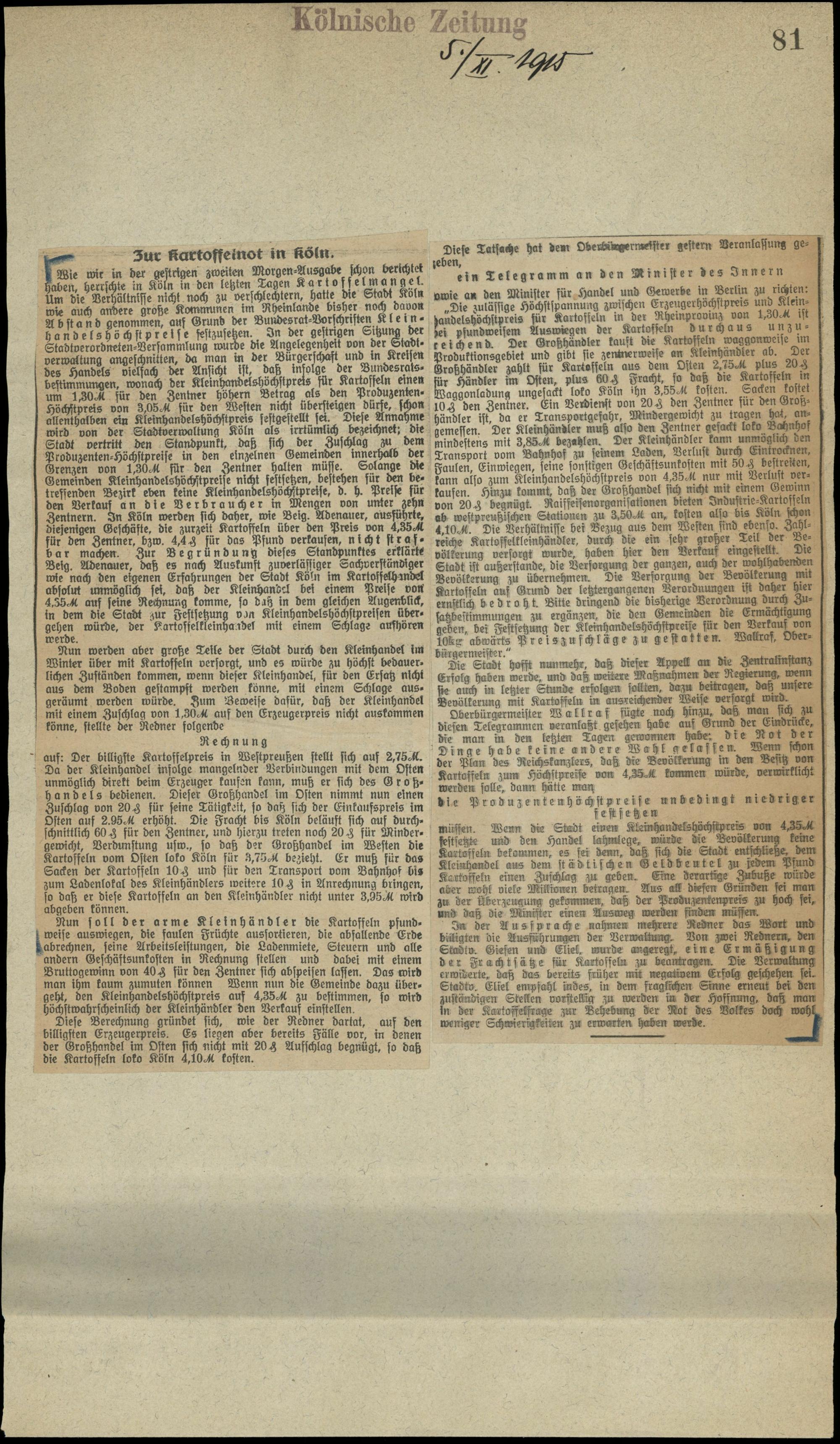 Zur Kartoffelnot in Köln.