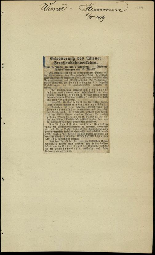 / Erweiterung des Wiener Straßenbahnverkehrs. 1.4.1919