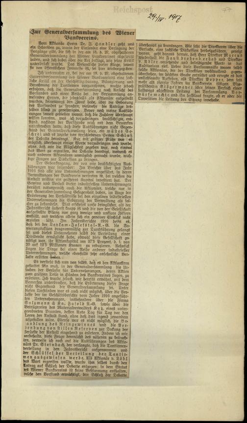 / Zur Generalversammlung des Wiener Bankvereins. 29.4.1917