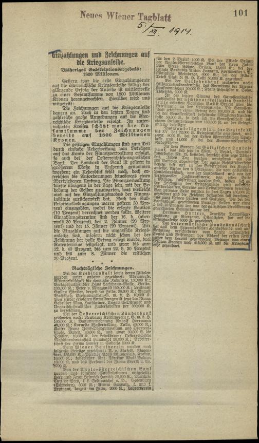 / Einzahlungen und Zeichnungen auf die Kriegsanleihe. 5.12.1914