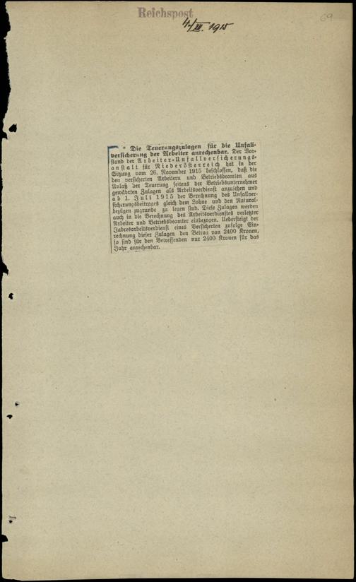 / Die Teuerungszulagen für die Unfallversicherung der Arbeiter anrechenbar. 4.12.1915