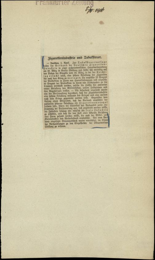 / Zigarettenindustrie und Tabaksteuer. 8.4.1916