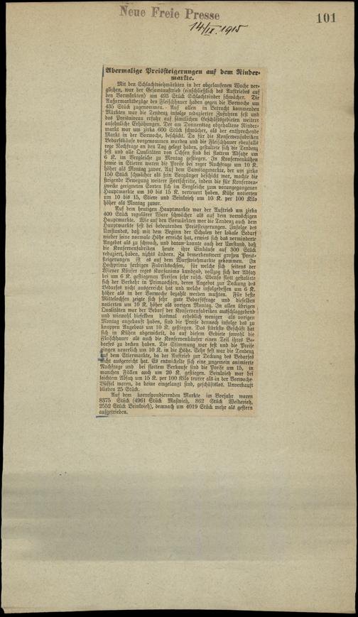 / Abermalige Preissteigerungen auf dem Rindermarkte. 14.9.1915