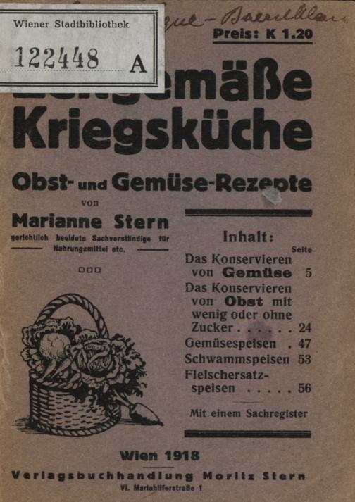 Zeitgemäße Kriegsküche : Obst- und Gemüse-Rezepte ; mit einem Sachregister / von Marianne Stern. Wien : Stern, 1918. Wienbibliothek im Rathaus, A-122448, https://resolver.obvsg.at/urn:nbn:at:AT-WBR-10654 / Public Domain Mark 1.0