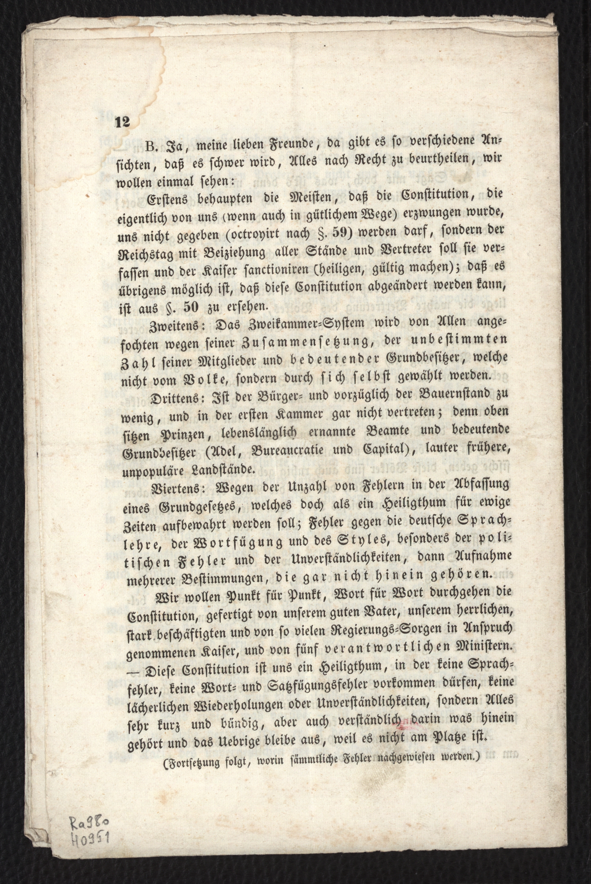 Die österreichische Verfassungs-Urkunde : in der Abfassung: mit einer Anzahl von Fehlern gegen die deutsche Sprachlehre ... in den Grundsätzen: mit mehreren Fehlern gegen einer volksthümlichen freisinnigen Politik / Nachgewiesen von Leopold Engländer, Bürger und Wirth. Alservorstadt, Währingergasse Nr. 275