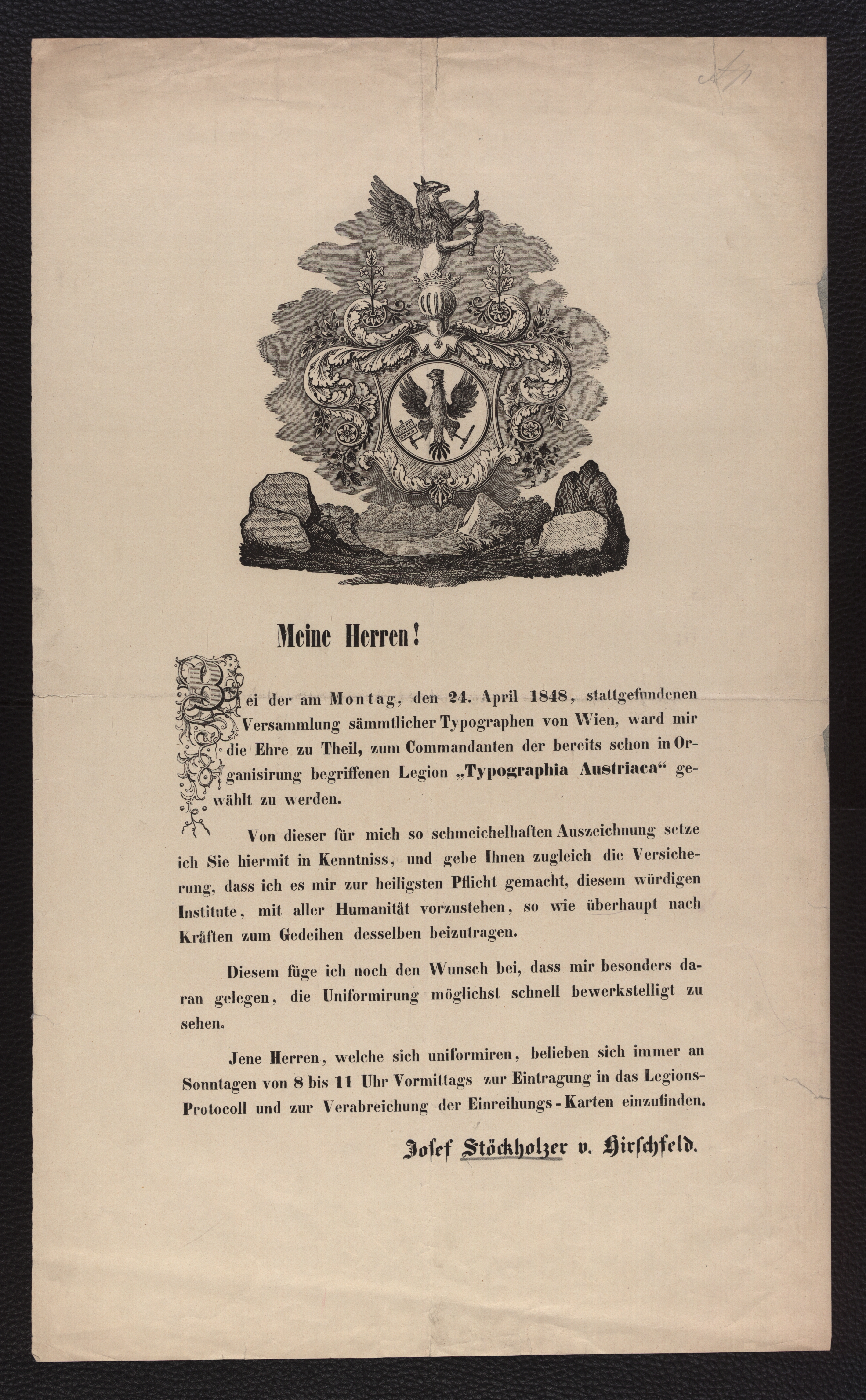 Meine Herren! : Bei der am Montag, den 24. April 1848, stattgefundenen Versammlung sämmtlicher Typographen von Wien, ward mir die Ehre zu Theil, zum Commandanten der bereits schon in Organisirung begriffenen Legion "Typographica Austriaca" gewählt zu werden ... / Josef Stöckholzer v. Hirschfeld
