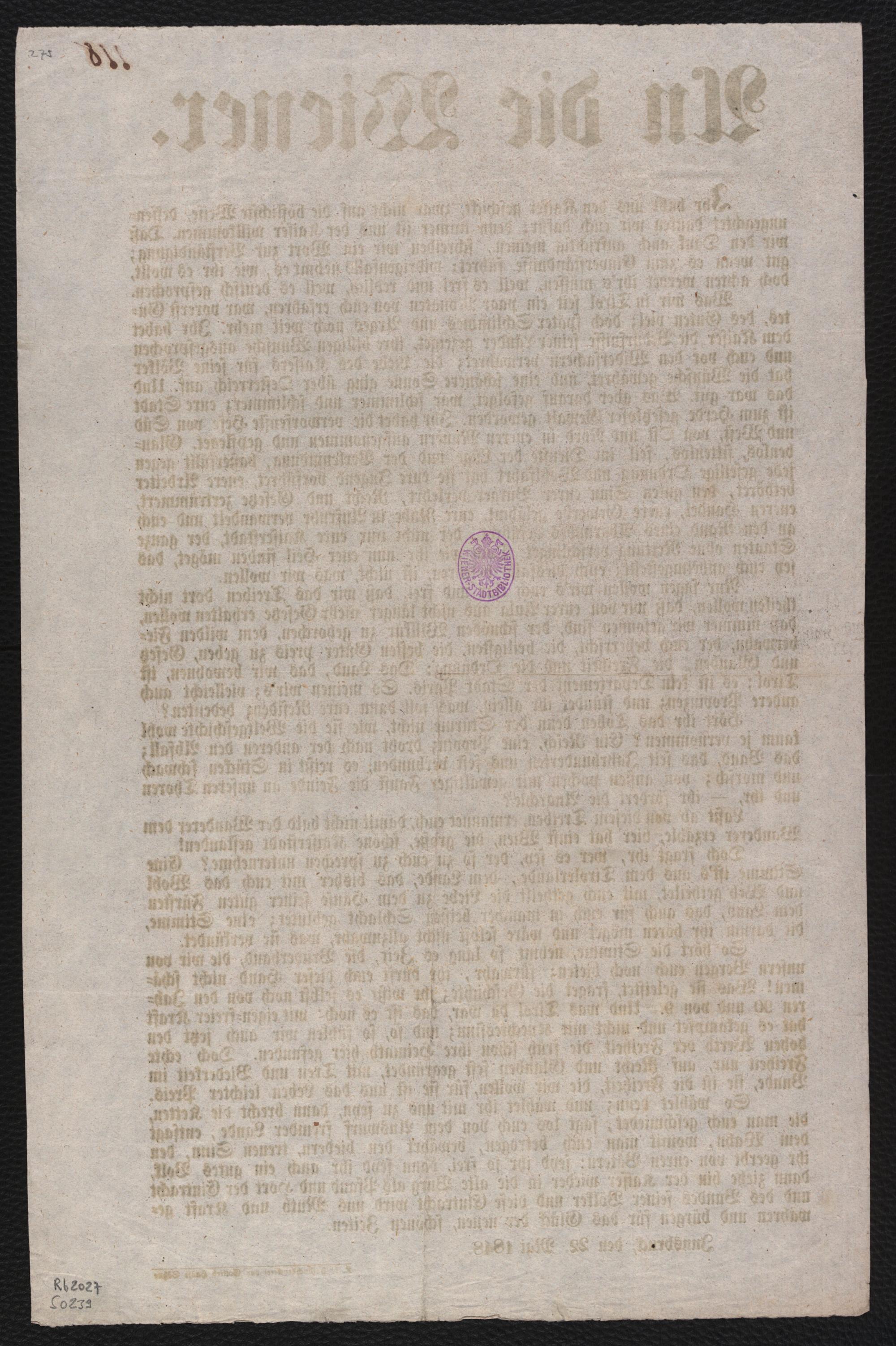 An die Wiener : Ihr habt uns den Kaiser geschickt, zwar nicht auf die höflichste Weise, dessenungeachtet danken wir euch dafür; denn immer ist uns der Kaiser willkommen ... ; Innsbruck, den 22. Mai 1848