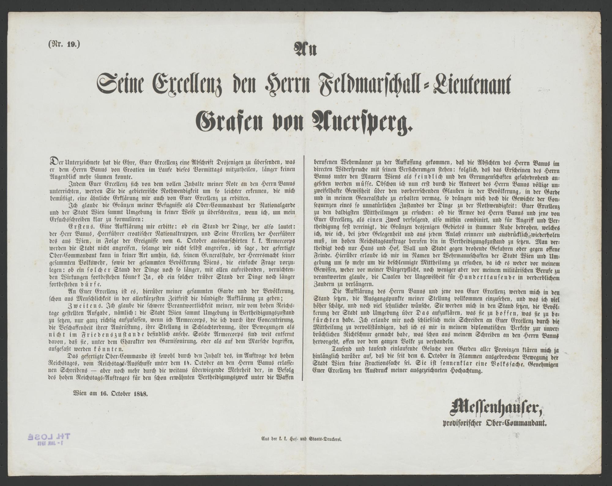 An Seine Excellenz den Herrn Feldmarschall-Lieutenant Grafen von Auersperg : Der Unterzeichnete hat die Ehre, Euer Excellenz eine Abschrift Desjenigen zu übersenden, was er dem Herrn Banus von Croatien im Laufe dieses Vormittags mitzutheilen, länger keinen Augenblick mehr säumen konnte ... ; Wien am 16. October 1848 / Messenhauser, provisorischer Ober-Commandant
