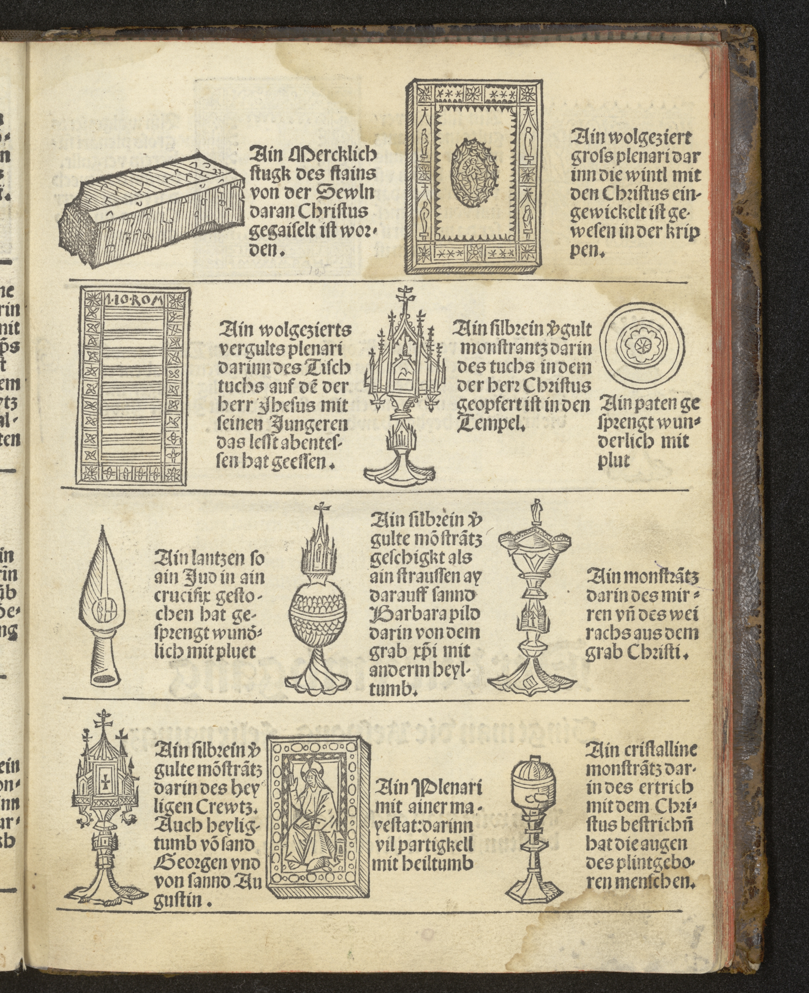 In disem Buechl sein Alle vnnd yede Stuckh des hochwirdigen Hayltumbs der zeit In aller heyligenn Thumkirchen Sant steffan der stat Wienn in Osterreich verhandẽ vnd albeg den nagstñ Sũtag nach dem Ostertag Jarlich zaigt werden: dem nach: dem alten puchl vil stuck die erst her zwe kumẽ vnd in pesser Form pracht worden ab gen aigentlich verzaichnet. Anno Domini. 1514