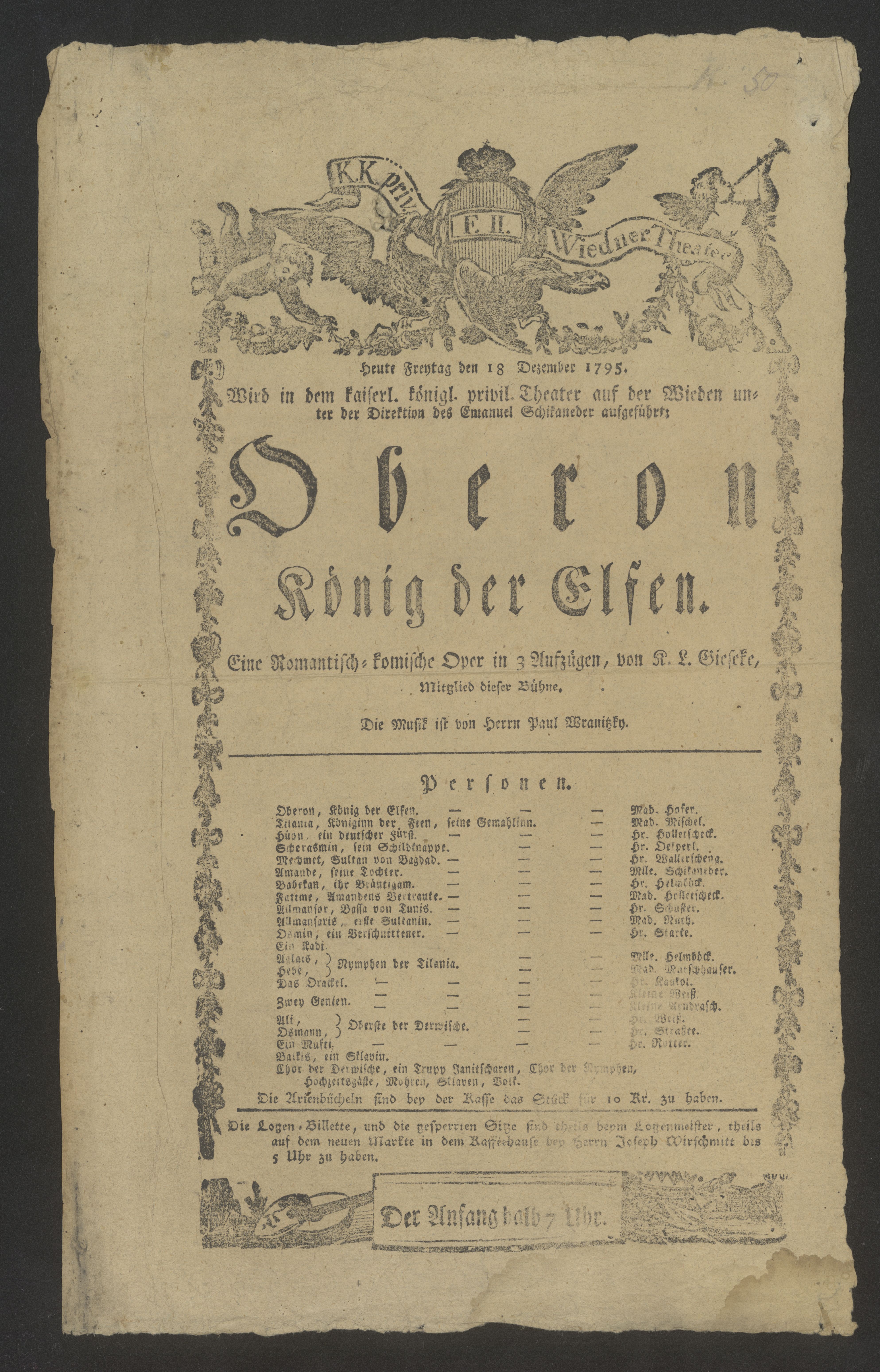 Heute Freytag den 18. Dezember 1795. Wird in dem kaiserl. königl. privil. Theater auf der Wieden unter der Direktion des Emanuel Schikaneder aufgeführt: Oberon König der Elfen. Eine Romantisch-komische Oper in 3 Aufzügen, von K. L. Gieseke, Mitglied dieser Bühne. Die Musik ist von Herrn Paul Wranitzky : Der Anfang halb 7 Uhr / K.K. priv. Wiedner Theater