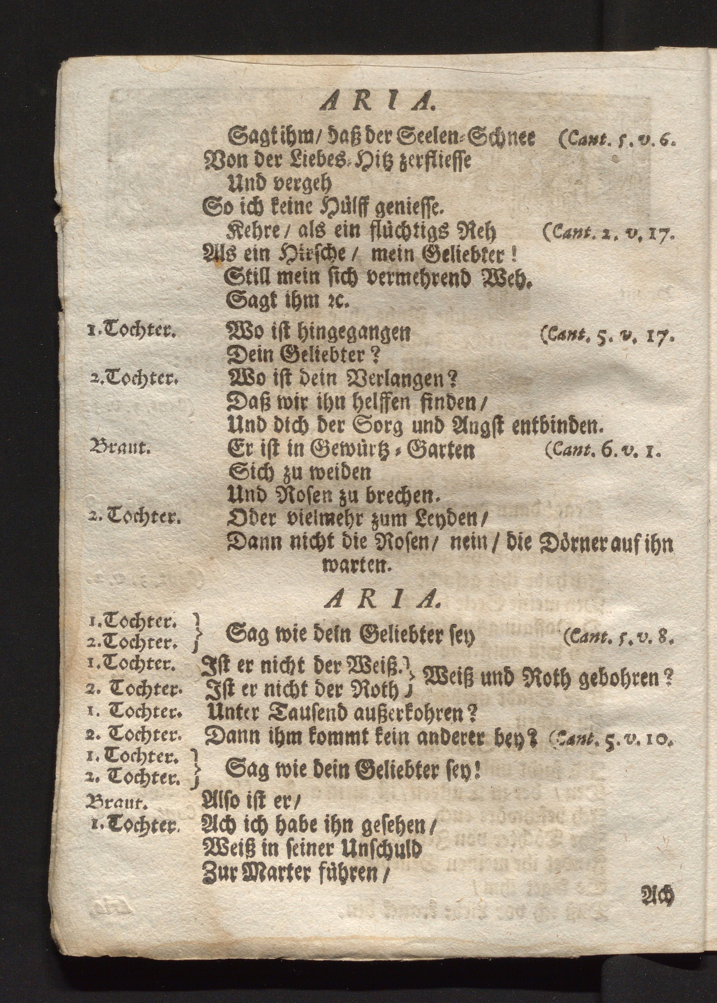 Suspiria Animæ Amantis : Adjuro vos Filiæ Hierusalem, si in veneritis dilectum meum, ut nuncietis ei, quia amore langueo. Cantic. 5. v. 8. Ich beschwöre euch ihr Töchter von Jerusalem, findet ihr meinen Geliebten, so saget ihm, daß ich vor Lieb kranck bin. Cantic. 5. v. 8. ; Oratorium, Das ist: Hertzliche Begierd Der Braut oder der Christlichen Kirchen In dem hohen Lied Salomonis zu ihren Bräutigamb, oder ihren über Todt und Welt triumphirenden Heyland. Welches Bey dem heiligen Grabe In der Kirchen derer Wohl-Ehrwürdigen Chor- und Closter-Frauen deß Fürstlichen Stüfft und Closters zur Himmels-Porten, Am Heil. Charfreytag Nachmittag umb halber ein Uhr, in einem Trauer-Gesang allen Welt-Menschen vor Augen gestellt, und in die Music gesetzet wird / von Herrn Georg Reuter, Der Röm. Kayserl. Majest. Hof- und Cammer-Organisten, wie auch der Metropolitan-Kirchen bey St. Stephan Capell-Meistern