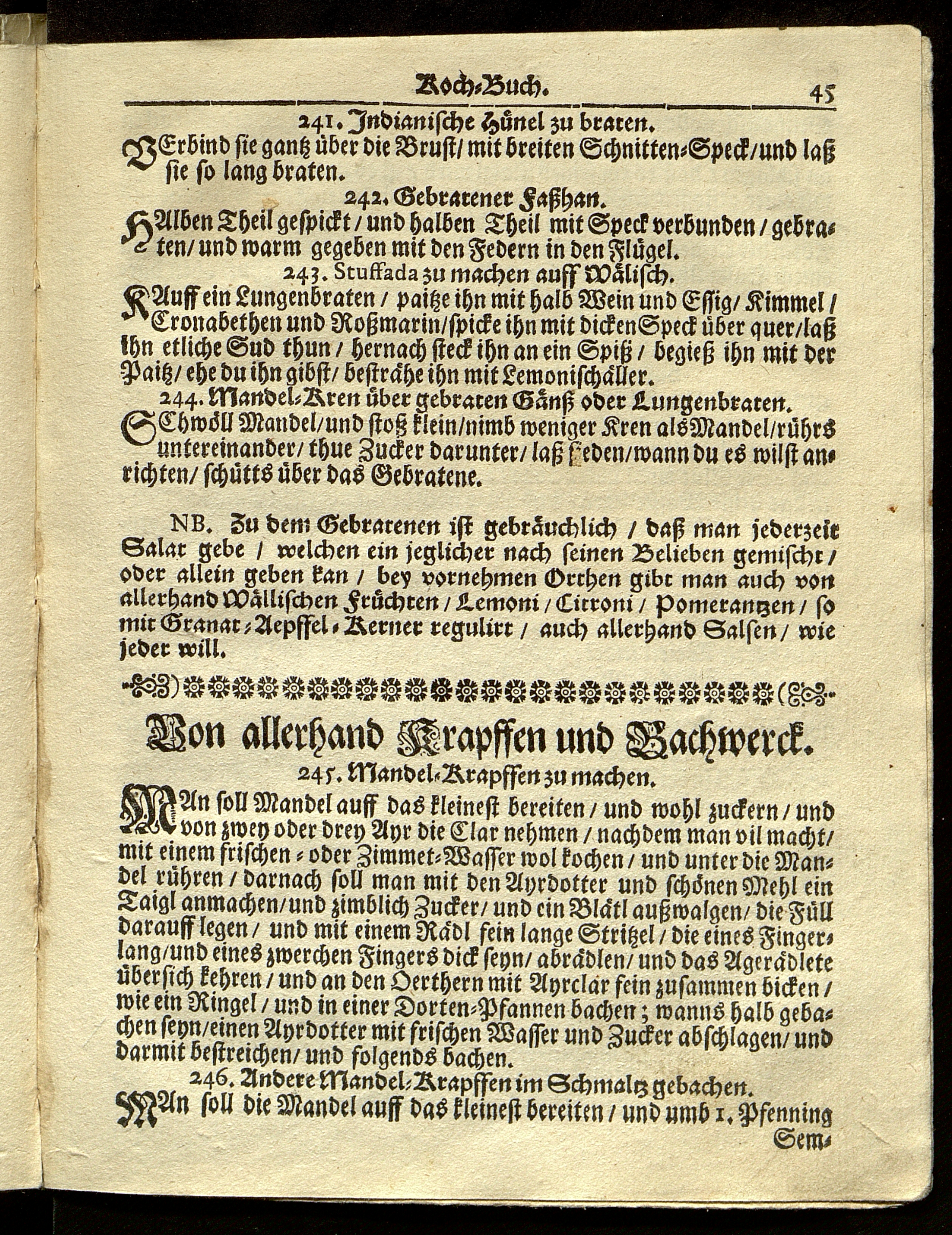 Ein gantz neues und nutzbares Koch-Buch : In welchem zu finden, Wie man verschiedene herrliche und wohl-schmäckende Speisen von gesottenen, gebrattenen und gebachenen, als allerhand Pastetten, Dorten, Karpffen, [et]c. sehr künstlich und wohl zurichten / Von einer Hoch-Adelichen Persohn zusammen getragen [i.e. Eleonora Maria Rosalia von Liechtenstein]
