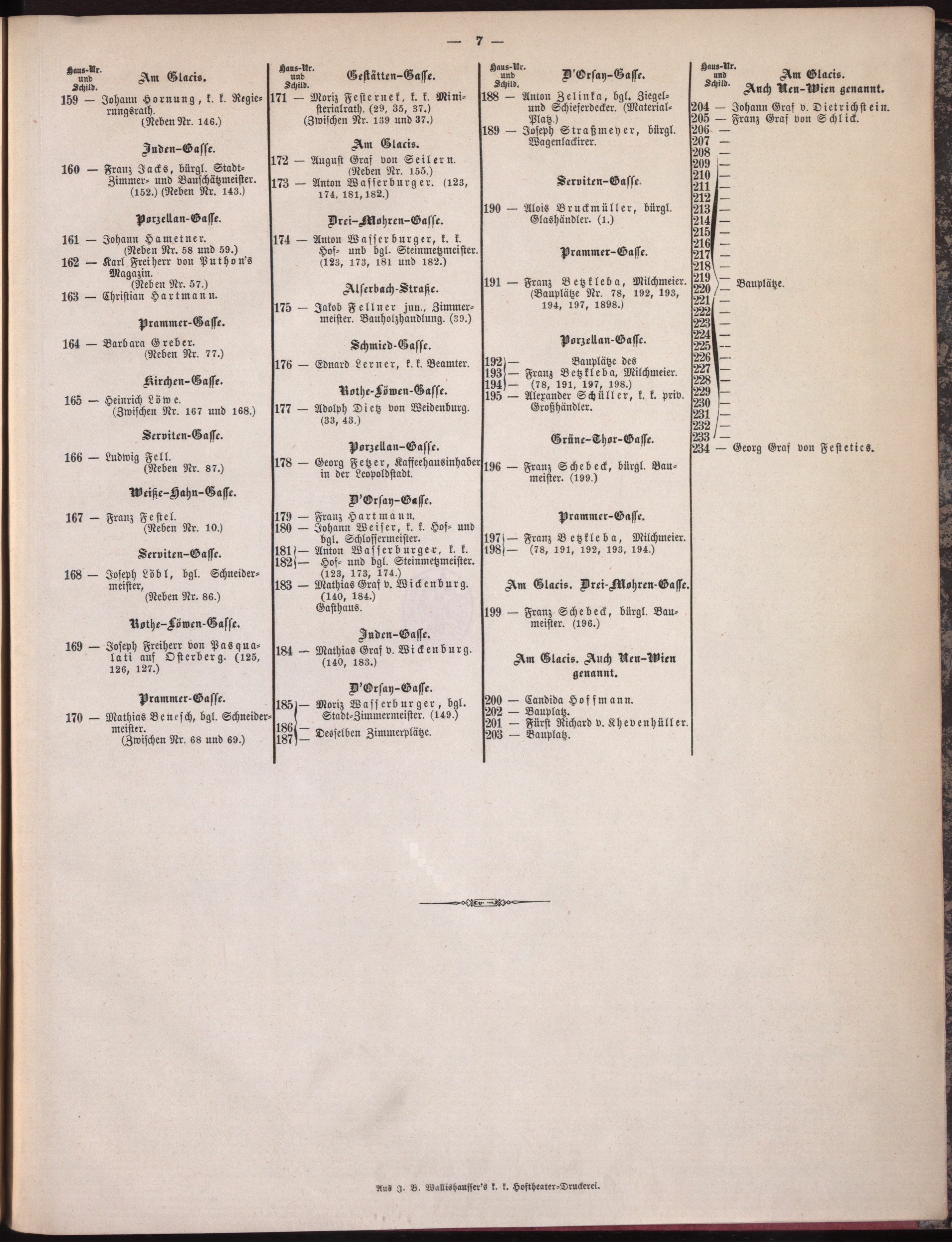 Neuester Wiener Häuser-Schema für das Jahr 1861 : kaiserl. königl. Reichshaupt- und Residenzstadt Wien mit sämmtlichen Vorstädten, eingetheilt in acht kaiserliche königliche Polizei-Bezirke mit Angabe der Haueigenthümer etc. etc. nebst colorirten Grundrissen zur leichtfaßlichen Auffindung der Straßen und der mit Nummern bezeichneten Gebäude / entworfen und hrsg. von Anton Ziegler