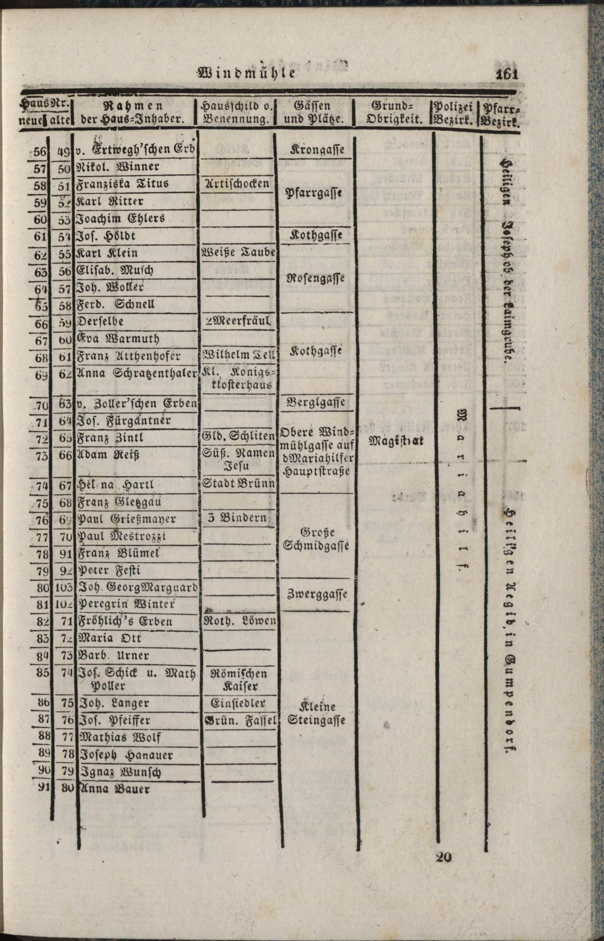 Neuester, verbesserter Schema aller in der k. k. Haupt- und Residenzstadt Wien und in ihren Vorstädten befindlichen Häusern : ein nothwendiges Handbuch für Jedermann, als richtiger Wegweiser durch die Stadt und sämmtliche 34 Vorstädte. Mit genauer Angabe sämmtlicher Haus-Nummern, aller dermaligen Hauseigenthümer und Hausschilder, Straßen, Plätze, Grundobrigkeiten, dann Polizei- und Pfarr-Bezirke / verfaßt und zu haben, am Kohlmarkte Nr. 281, gegenüber vom Graben, im ersten Stock