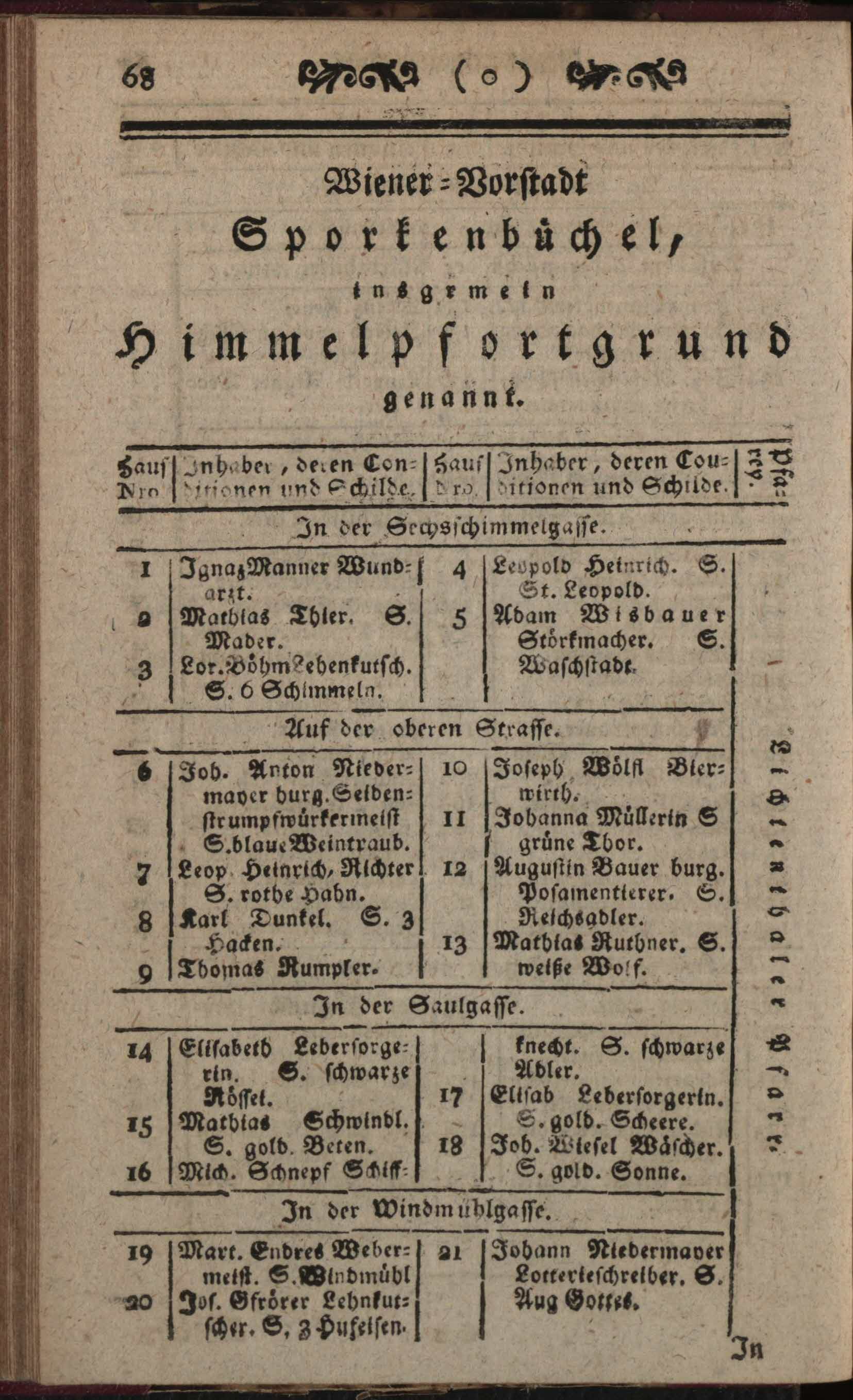 Verzeichniß der in der k. k. Haupt- und Residenzstadt Wien samt den dazu gehörigen Vorstädten und Gründen befindlichen numerirten Häuser, derselben wahrhaften Eigenthümer, deren Konditionen und Schilder : nebst der nach allerhöchster k. k. Verordnung ergangenen neuen Pfarreintheilung ; Auf das genaueste nach den Konskriptions- und herrschaftlichen Grundbüchern von neuem entworfen / von Karl Hofer