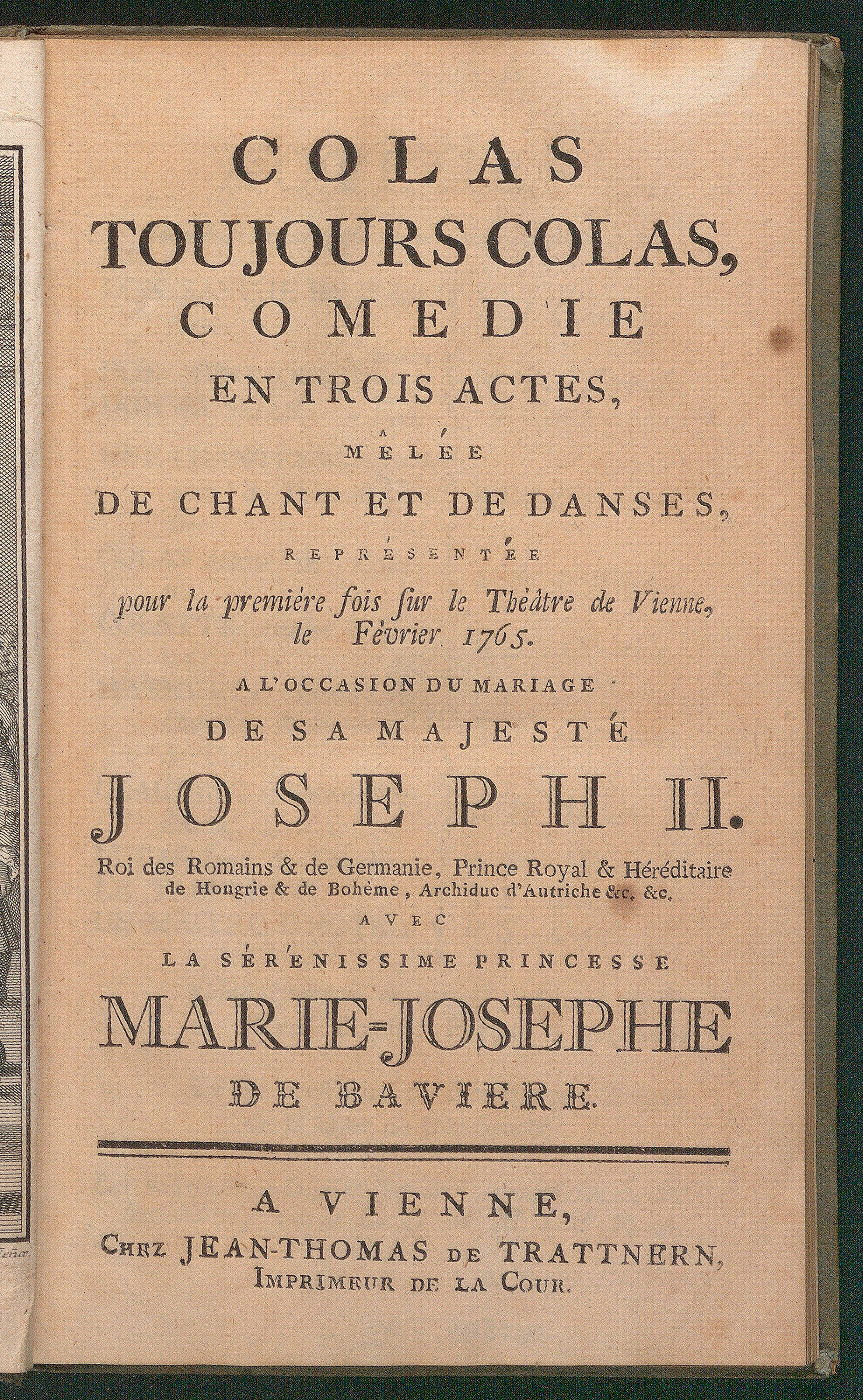 Colas Toujours. Colas, Comedie En Trois Actes, Mêlée De Chant Et De Danses, Représentée pour la première fois sur le Théâtre de Vienne, le Février 1765 A L'Occasion Du Mariage De Sa Majesté Joseph II. ...Avec La Sérénissime Princesse Marie-Josephe De Baviere