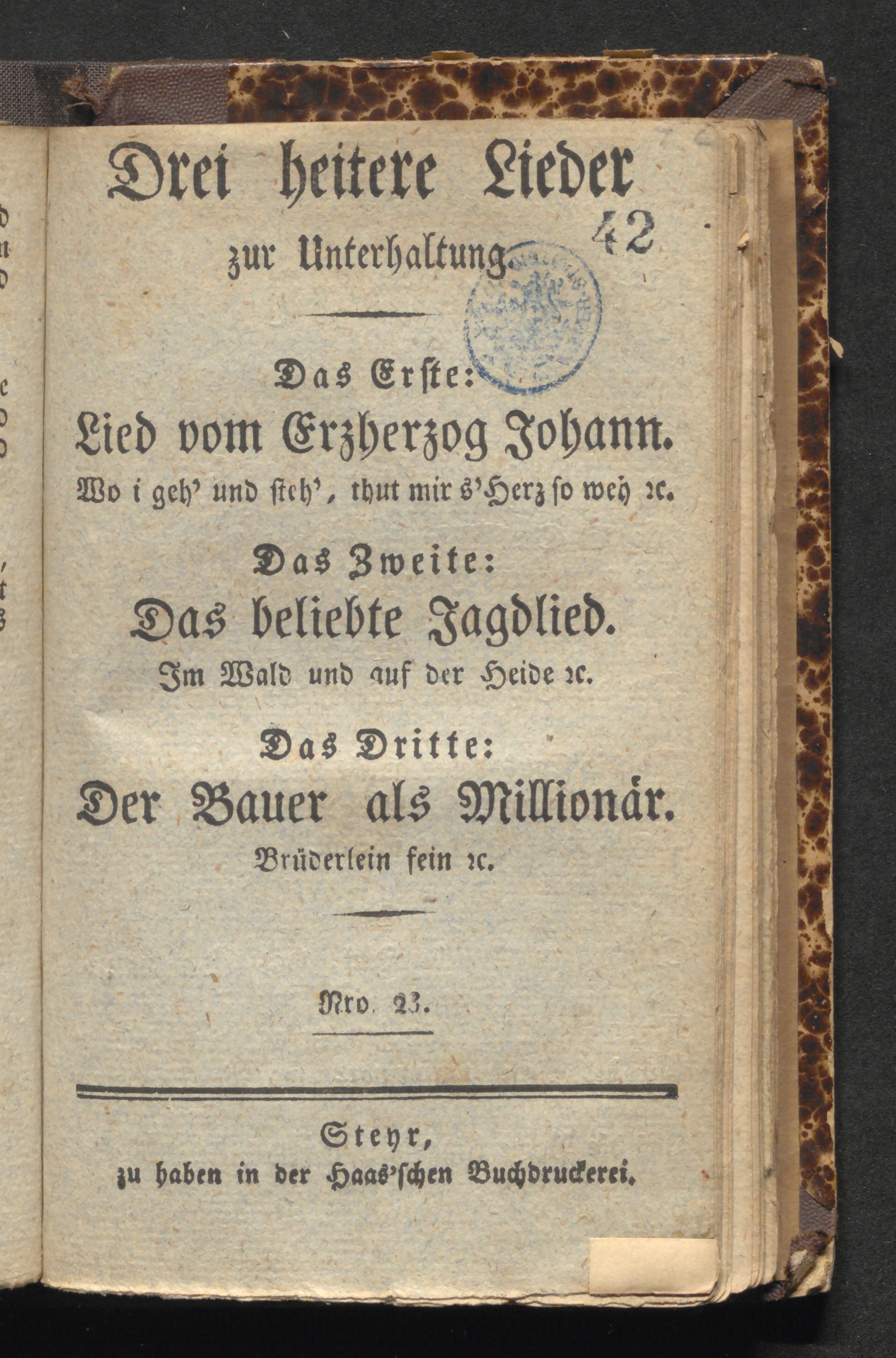 Drei heitere Lieder zur Unterhaltung : Das Erste: Lied vom Erzherzog Johann. Wo i geh' und steh', thut mir s'Herz so weh &c. Das Zweite: Das beliebte Jagdlied. Im Wald und auf der Heide &c. Das Dritte: Der Bauer als Millionär. Brüderlein fein &c.
