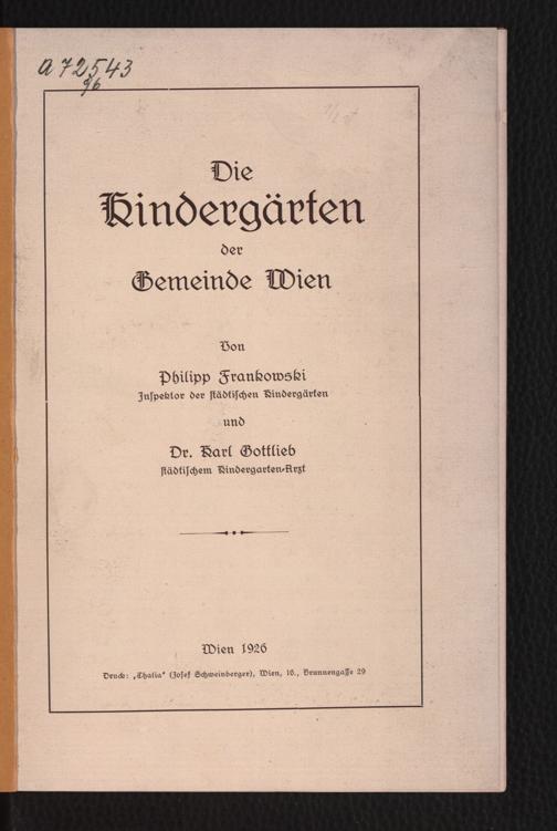 Die Kindergärten der Gemeinde Wien / von Philipp Frankowski und Karl Gottlieb. Wien : Thalia, 1926