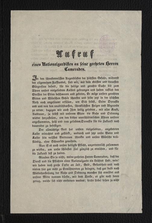 Aufruf eines Nationalgardisten an seine geehrten Herren Cameraden : [Wien, den 15. März 1848] / [R. S*****]. [Wien] : A. Dorfmeister's Buchdruckerei, 1848. Wienbibliothek im Rathaus, Ra-18, https://resolver.obvsg.at/urn:nbn:at:AT-WBR-60989 / Public Domain Mark 1.0