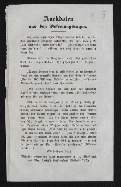 Anekdoten aus den Befreiungstagen. [Wien] : Klopf und Eurich, [s.a. 1848]