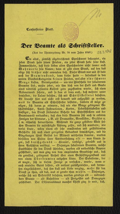 Der Beamte als Schriftsteller : Censurfreies Blatt ; (Aus der Theaterzeitung Nr. 70 vom Jahre 1848) / A. C. Naske. [Wien] : Gedruckt bei Anton Benko, 1848. Wienbibliothek im Rathaus, Ra-82, https://resolver.obvsg.at/urn:nbn:at:AT-WBR-62183 / Public Domain Mark 1.0