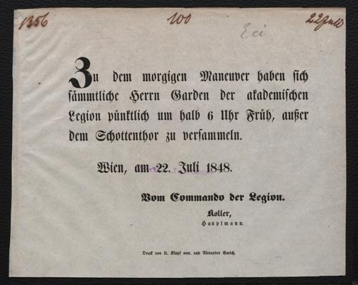 Zu dem morgigen Maneuver haben sich sämmtliche Herrn Garden der akademischen Legion ... / Vom Commando der Legion. Koller, Hauptmann. [Wien] : Druck von U. Klopf sen. und Alexander Eurich, 1848. Wienbibliothek im Rathaus, Ra-533, https://resolver.obvsg.at/urn:nbn:at:AT-WBR-63923 / Public Domain Mark 1.0