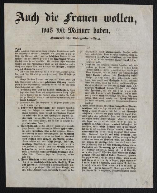 Auch die Frauen wollen, was wir Männer haben : Humoristische Gelegenheitsskizze / [Joseph Mayer]. [Wien] : K. K. Hofbuchdruckerei des L. Sommer (vormals Strauß), [s.a. 1848]. Wienbibliothek im Rathaus, Ra-291, https://resolver.obvsg.at/urn:nbn:at:AT-WBR-66335 / Public Domain Mark 1.0