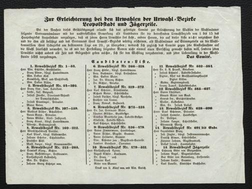 Zur Erleichterung bei den Urwahlen der Urwahl-Bezirke Leopoldstadt und Jägerzeile / Das Comité. [Wien] : Druck von U. Klopf sen. und Alex. Eurich, [s.a. ca. 1848]. Wienbibliothek im Rathaus, Ra-913, https://resolver.obvsg.at/urn:nbn:at:AT-WBR-67534 / Public Domain Mark 1.0