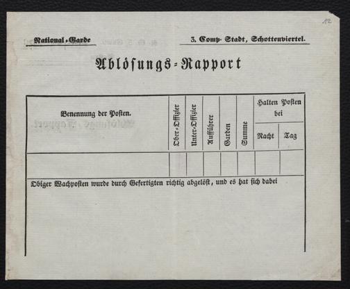 Ablösungs-Rapport : National-Garde ; 3. Comp. Stadt, Schottenviertel. [Wien], [s.a. 1848]. Wienbibliothek im Rathaus, Ra-4703, https://resolver.obvsg.at/urn:nbn:at:AT-WBR-75921 / Public Domain Mark 1.0