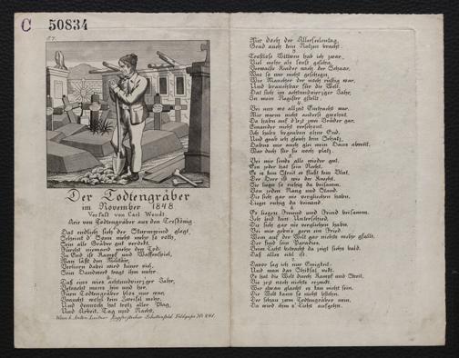 Der Todtengräber im November 1848 / Verfast [!] von Carl Wendt. Wien : b. Anton Leitner Kupferstecher Schottenfeld Feldgasse No. 241, [s.a. ca. 1848]. Wienbibliothek im Rathaus, Ra-1490, https://resolver.obvsg.at/urn:nbn:at:AT-WBR-76156 / Public Domain Mark 1.0