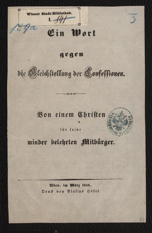 Ein Wort gegen die Gleichstellung der Confessionen. Von einem Christen für seine minder belehrten Mitbürger. Wien : Höfel, 1848. Wienbibliothek im Rathaus, Ra-4759, https://resolver.obvsg.at/urn:nbn:at:AT-WBR-76319 / Public Domain Mark 1.0