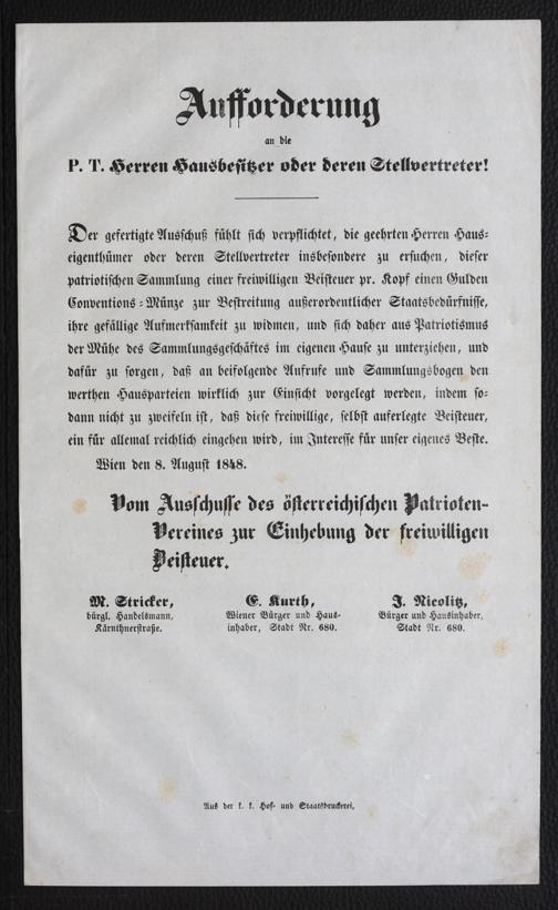 - TitelAufforderung an die P. T. Herren Hausbesitzer oder deren Stellvertreter! : Der gefertigte Ausschuß fühlt sich verpflichtet, die geehrten Herren Hauseigenthümer oder deren Stellvertreter insbesondere zu ersuchen, dieser patriotischen Sammlung einer freiwilligen Beisteuer pr. Kopf einen Gulden Conventions-Münze zur Bestreitung außerordentlicher Staatsbedürfnisse, ihre gefällige Aufmerksamkeit zu widmen ... ; Wien den 8. August 1848 / Vom Ausschusse des österreichischen Patrioten-Vereines zur Einhebung der freiwilligen Beisteuer. M. Stricker, bürgl. Handelsmann, Kärnthnerstraße. E. Kurth, Wiener Bürger und Hausinhaber, Stadt Nr. 680. J. Ricolitz, Bürger und Hausinhaber, Stadt Nr. 680
