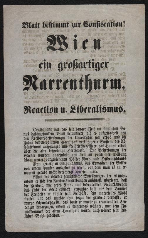 Blatt bestimmt zur Confiscation! Wien ein großartiger Narrenthurm. Reaction u. Liberalismus : [Nieder mit der Camarilla, den Zöpfen und Schwarzgelben! ; Wien, im September 1848] / [Zierrath]. [Wien] : Gedruckt bei Franz Edlen von Schmid, 1848. Wienbibliothek im Rathaus,