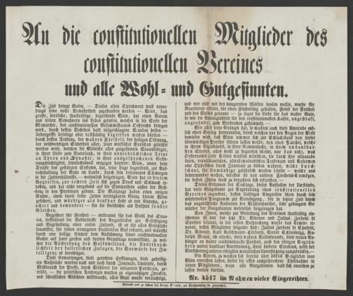 - QuellenangabeAn die constitutionellen Mitglieder des constitutionellen Vereines und alle Wohl- und Gutgesinnten : Die Zeit bringt Rosen ... Wien, das große, herrliche, thatkräftige, begreifende Wien, hat einen Verein aus seinen Bewohnern ins Leben gerufen, welcher [...] / Nr. 4517 im Nahmen vieler Eingereihter. [Wien] : Gedruckt und zu haben bei Leop. Grund, am Stephansplatz im Zwettelhofe, [s.a. 1848]. Wienbibliothek im Rathaus, Rc-4364, https://resolver.obvsg.at/urn:nbn:at:AT-WBR-106868 / Public Domain Mark 1.0