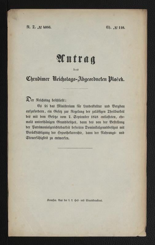 Antrag des Chrudimer Reichstags-Abgeordneten Plaček : Der Reichstag beschließt: Es sei das Ministerium für Landeskultur und Bergbau aufzufordern, ein Gesetz zur Regelung der zulässigen Theilbarkeit des mit [...]. Kremsier : Aus der k. k. Hof- und Staatsdruckerei, [s.a. ca. 1848]. Wienbibliothek im Rathaus, C-52534, https://resolver.obvsg.at/urn:nbn:at:AT-WBR-110852 / Public Domain Mark 1.0