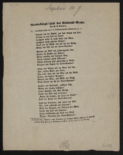 Ausrückungs-Lied der National-Garde : (In Musik gesetzt vom k. k. Hof-Kapellmeister Heinrich Proch.) / Von M. G. Saphir. [S.l.], [s.a. 1848]. Wienbibliothek im Rathaus, Ra-5003, https://resolver.obvsg.at/urn:nbn:at:AT-WBR-112432 / Public Domain Mark 1.0